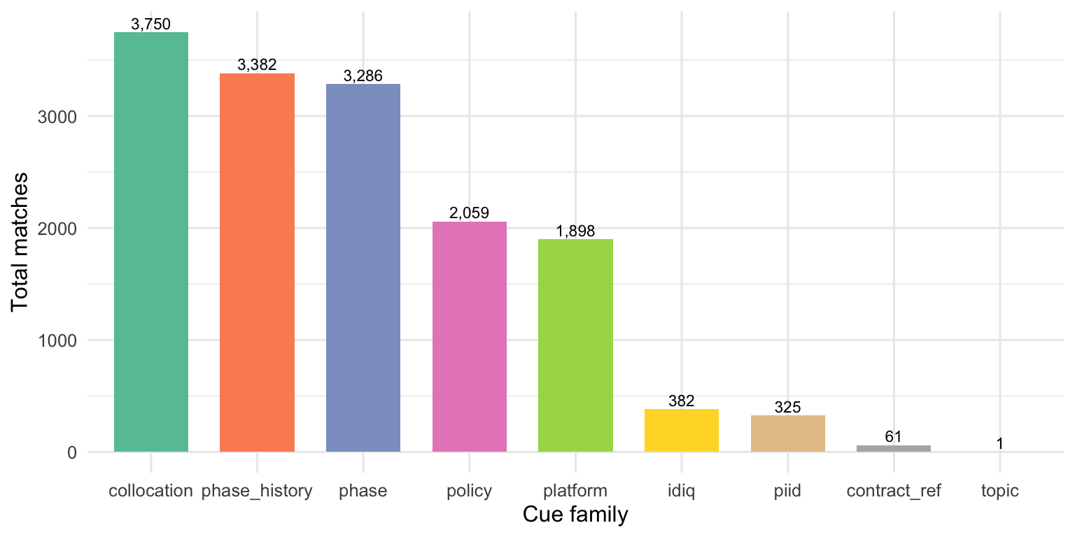 prior_sbir_referencecapture those chains for future audits. - Collocation + phase-history nets catch the long tail. 1,900+ collocation hits and ~1,000 phase-history hits ensure “previous SBIR” phrases or legacy phase mentions aren’t dropped even in messy descriptions.